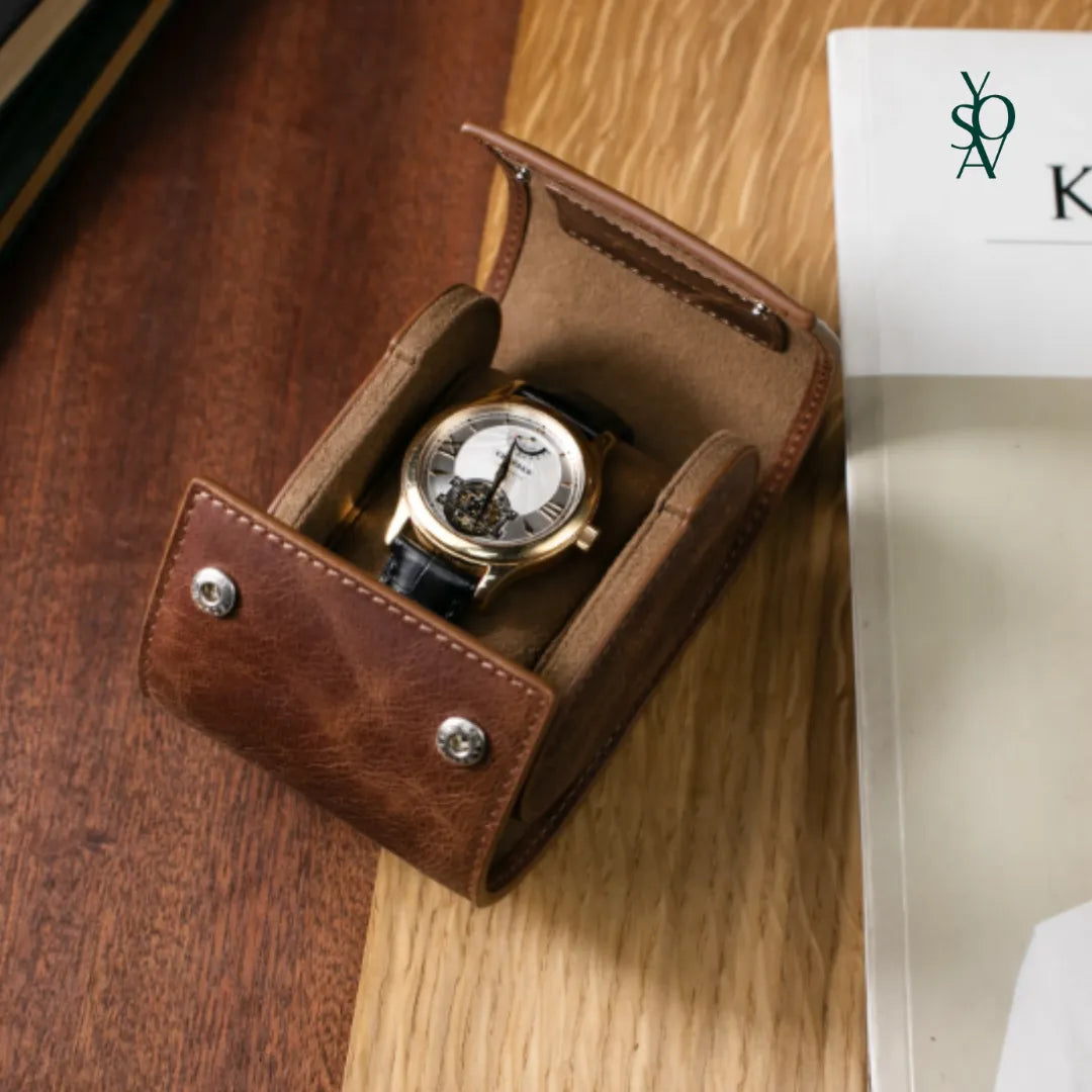 Discover unparalleled elegance with this expertly crafted watch case. Designed to cradle your timepiece in luxurious comfort, its rich brown leather exterior and soft interior lining ensure both style and protection. Perfect for travels or display, this case embodies sophistication in every detail.