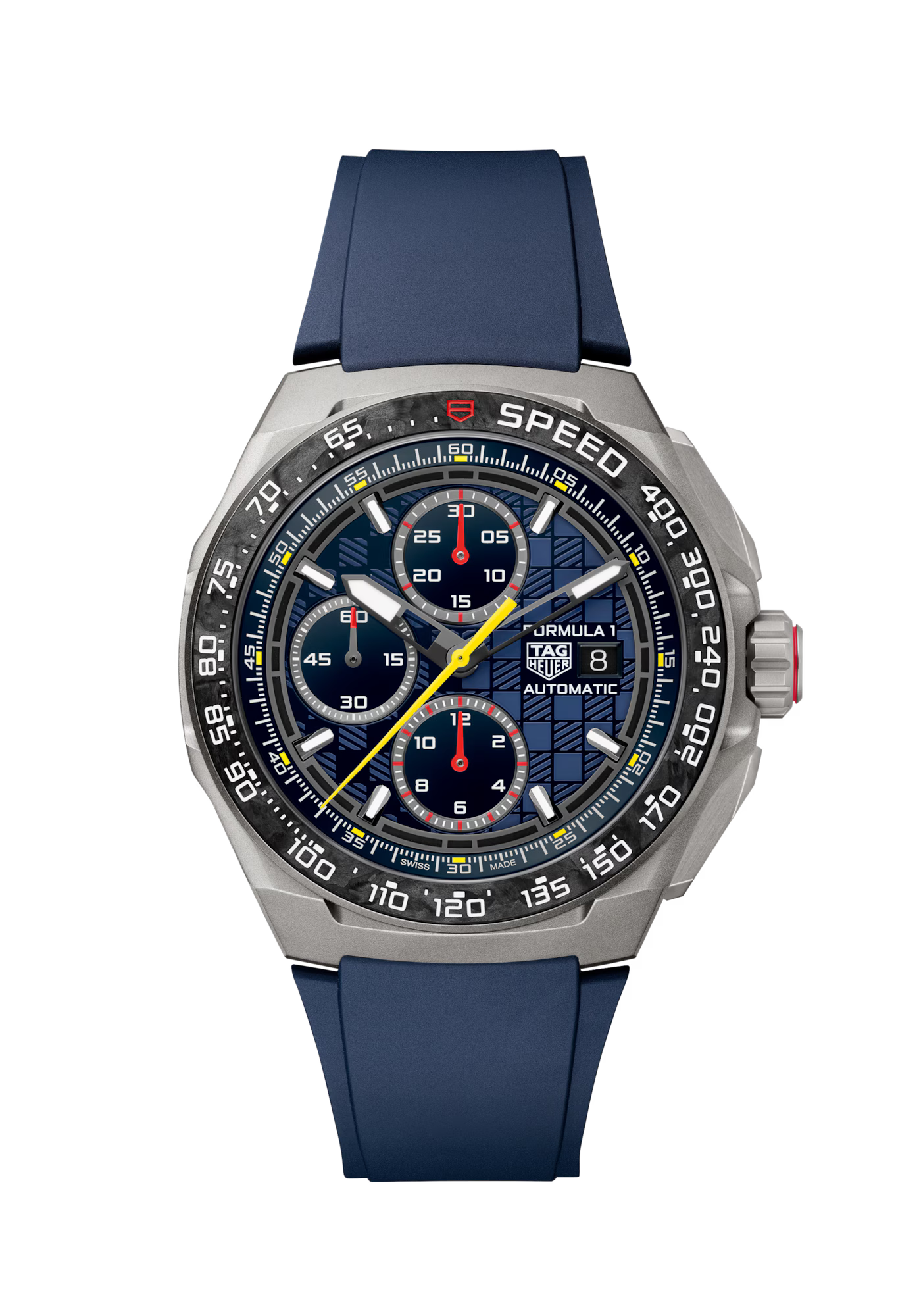 The TAG Heuer Formula 1 Chronograph introduces a bold new color scheme in 44mm. Featuring lime accents and a dynamic design, this watch is built for the modern racer who values precision and style.
